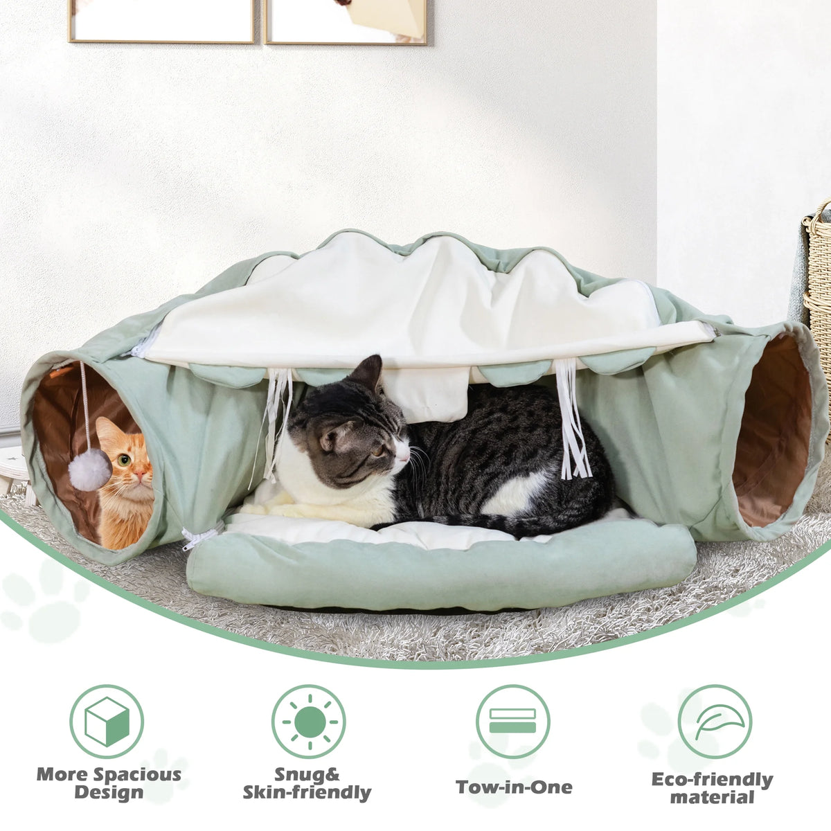 【Easy to Clean & Detach & Fold】With a zipper connection, the removable cat bed can be easily cleaned, and the detached cat tunnel can be adapted to curved or straight shapes. Moreover, the soft cat tunnel bed folds up easily when not in use, making it easy to take on the go!
