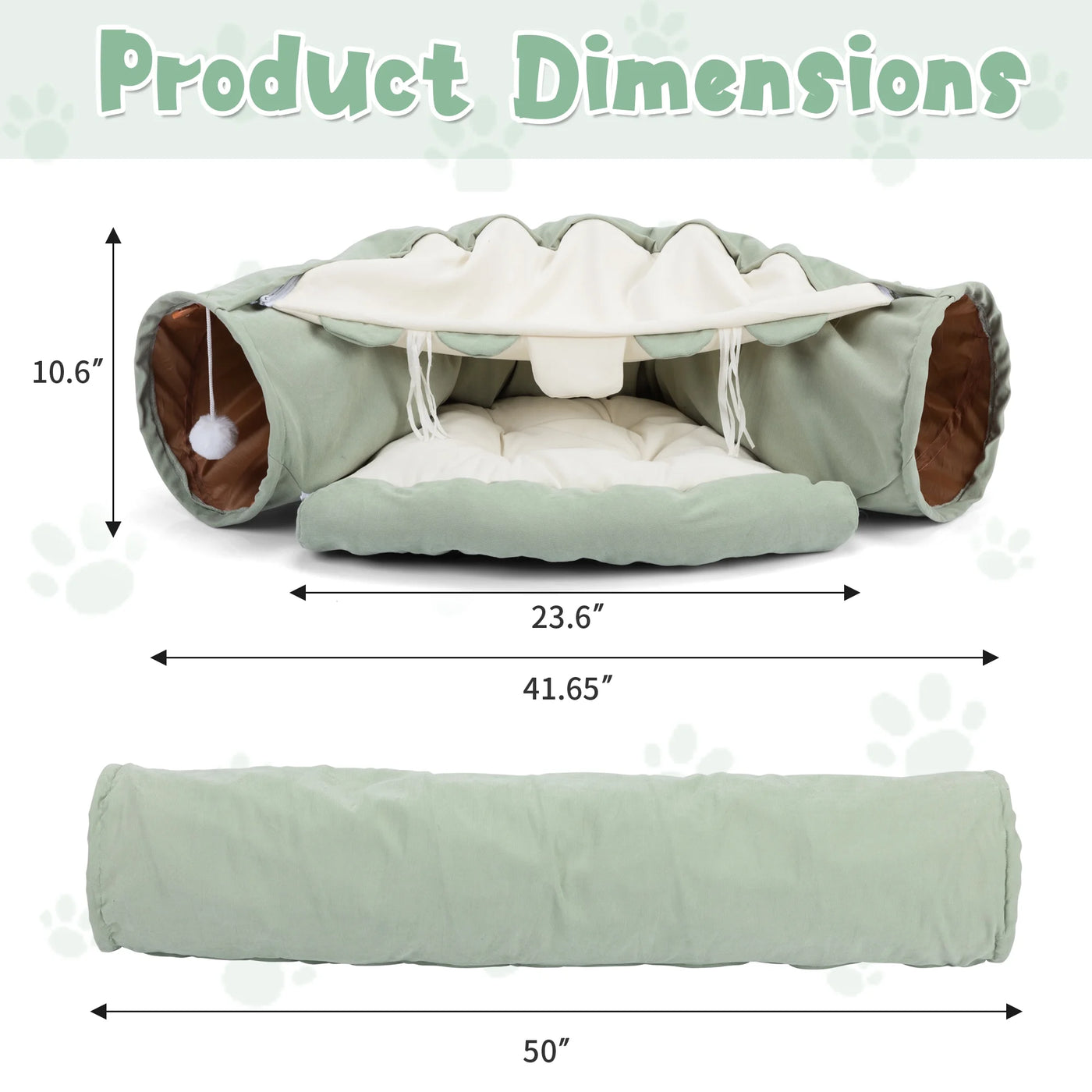 Specifications: Material: Plush Fabric + Polyester + PP Cotton Color: Light Green Overall Size: 49.6""L X 21.7""W x 10.6""H Tunnel Diameter: 10.6"" Tunnel Length: 50"" Cat House Length: 21.7"" Net Weight: 2.42 lbs