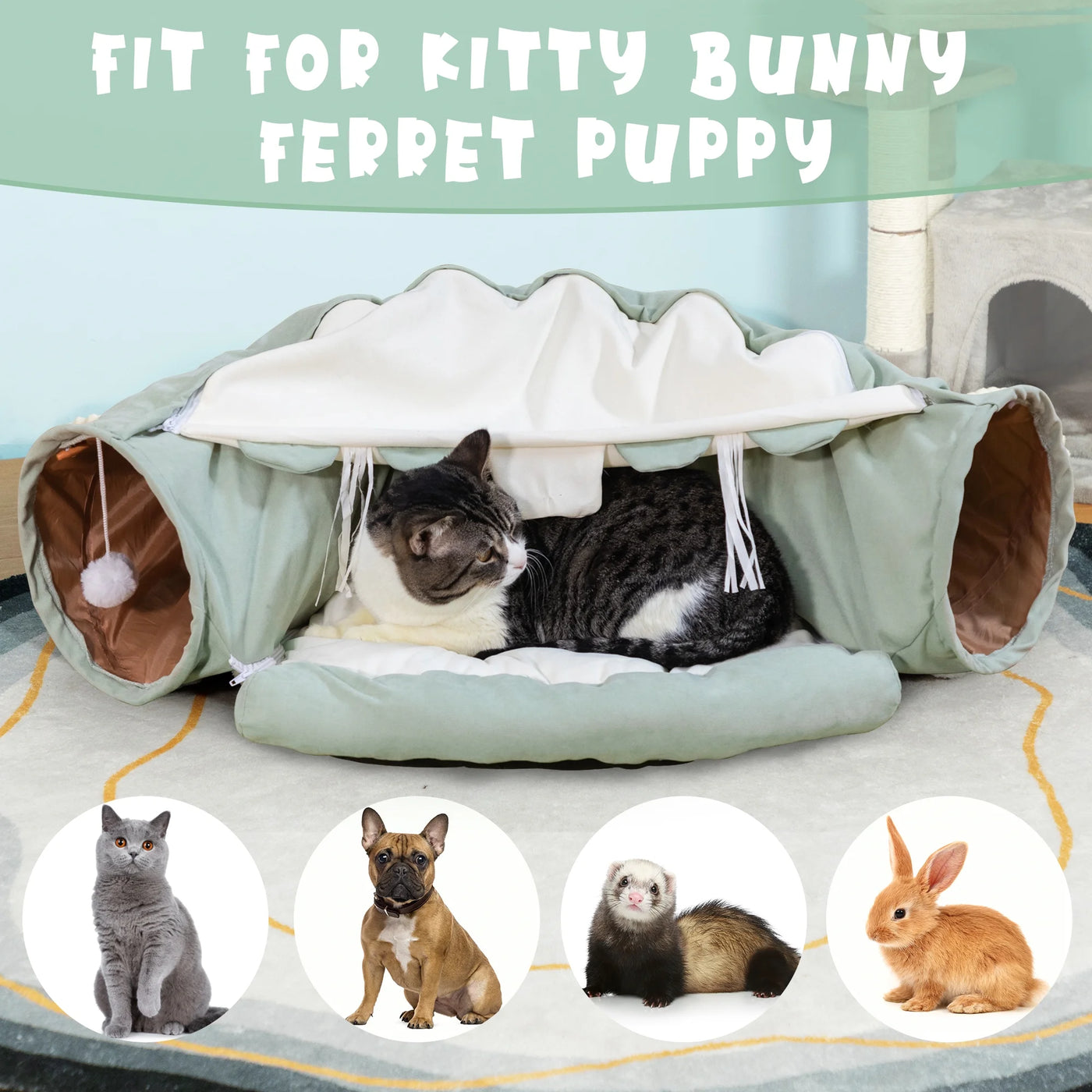 【2-in-1 Multifunctional Cat Tunnel Bed】This versatile cute cat tunnel bed features a 10.6-inch tunnel and cozy bed with built-in sound paper and toys, serving as a versatile burrow, hideout, tent, and bed for cats, small dogs, rabbits, guinea pigs, ferrets, chinchillas to play hide and seek or sleep.