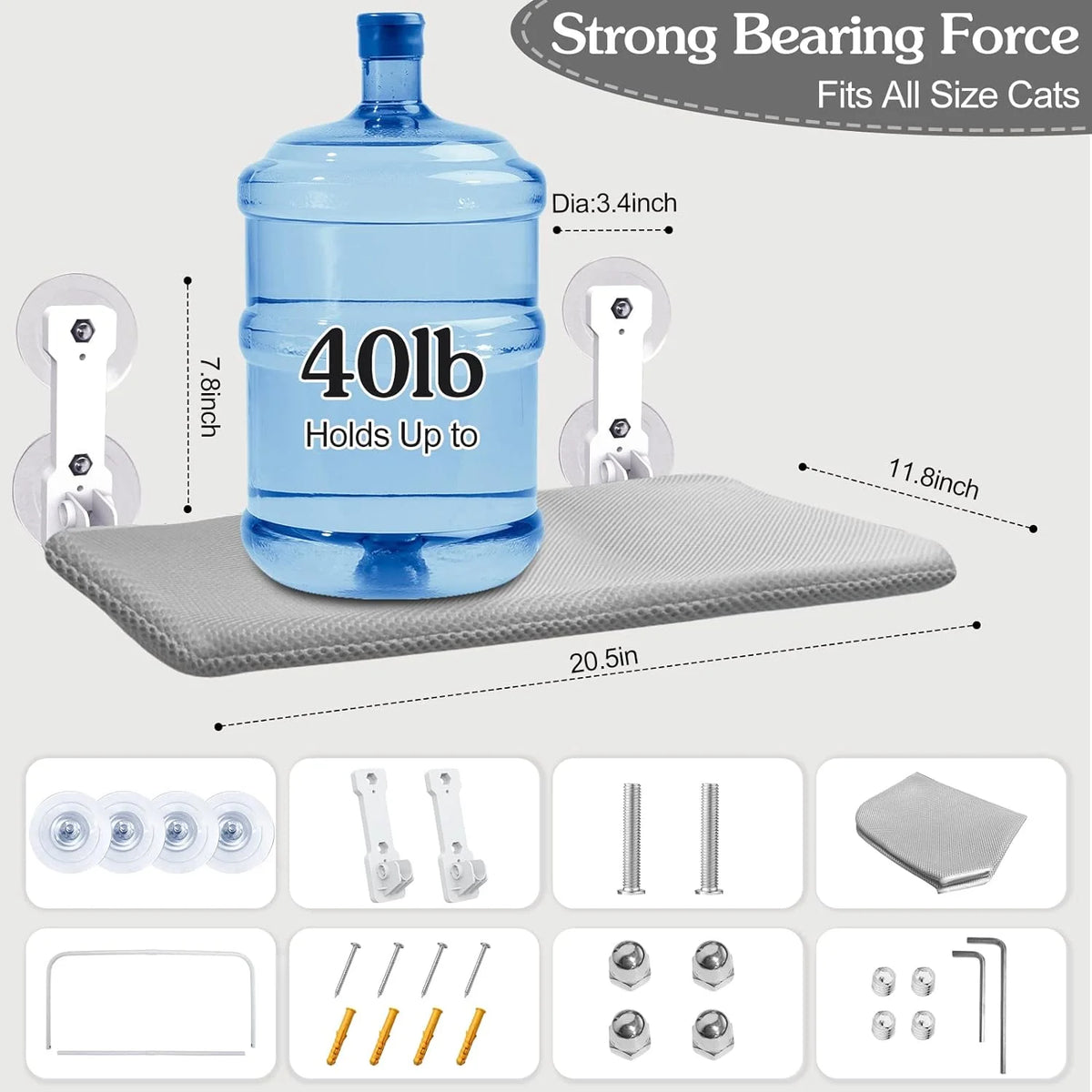 This small cat window perch, window hammock for cats inside, hanging cat bed is made of high-quality steel frame. Large strong power suction cups make it safety and steady. Hold up to an amazing 40 pounds. Comes with breathable washable easy clean mat helps to lose heat in summer.