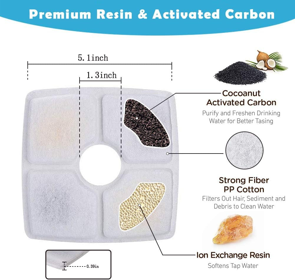 Each filter is composed of a cotton layer, activated carbon, and an ion exchange resin. They can filter hair, heavy metals, and improve the taste of the water so that pets can drink clean and fresh water all day, which helps to increase water consumption and reduce the risk of urinary tract infections.